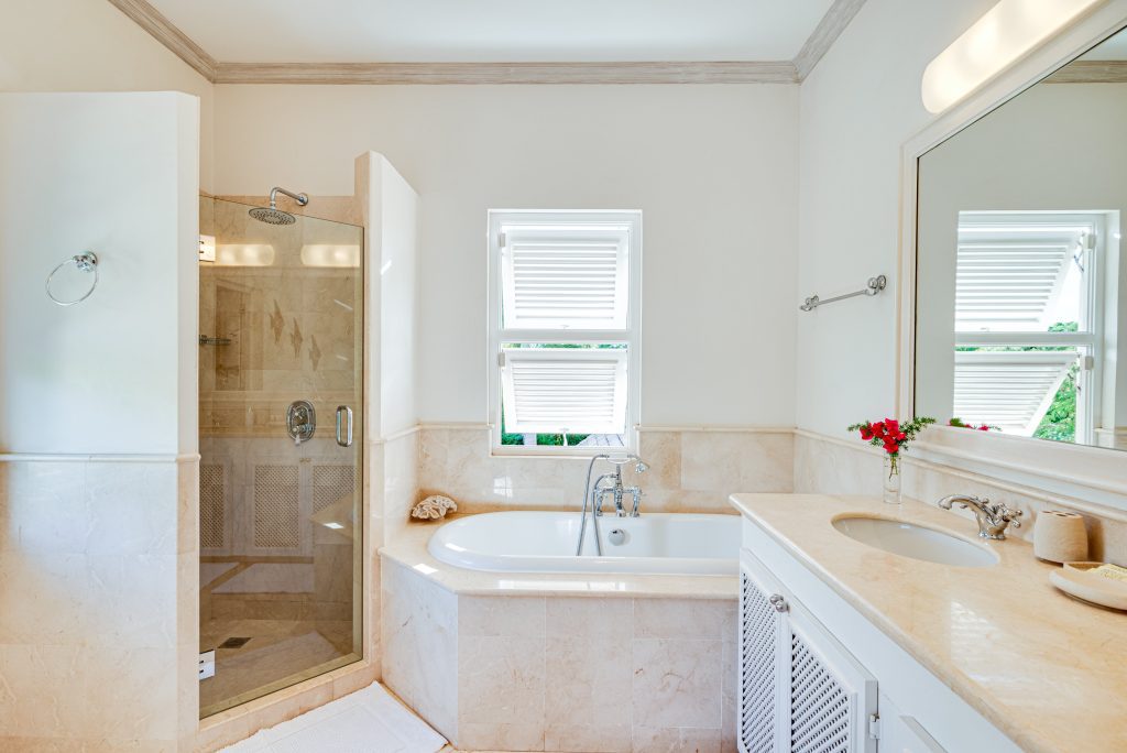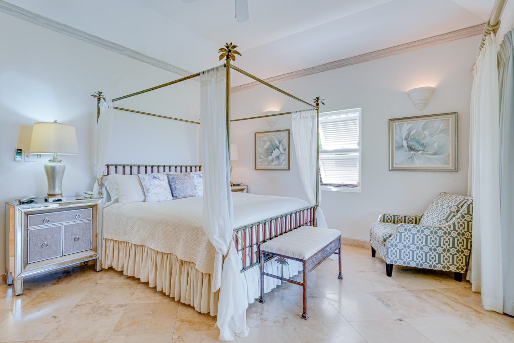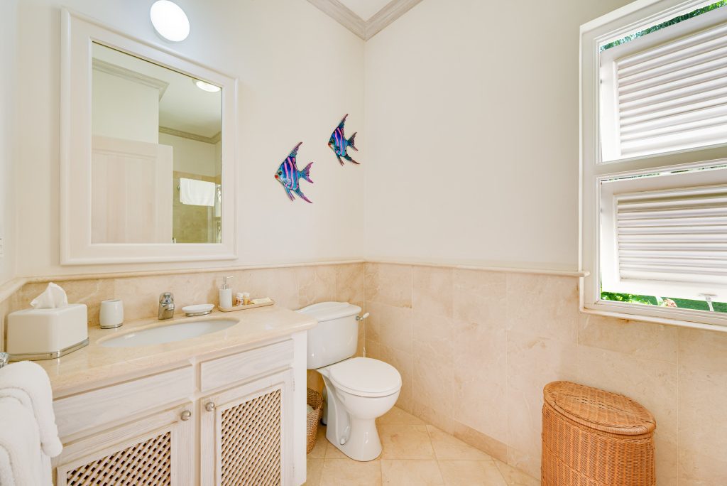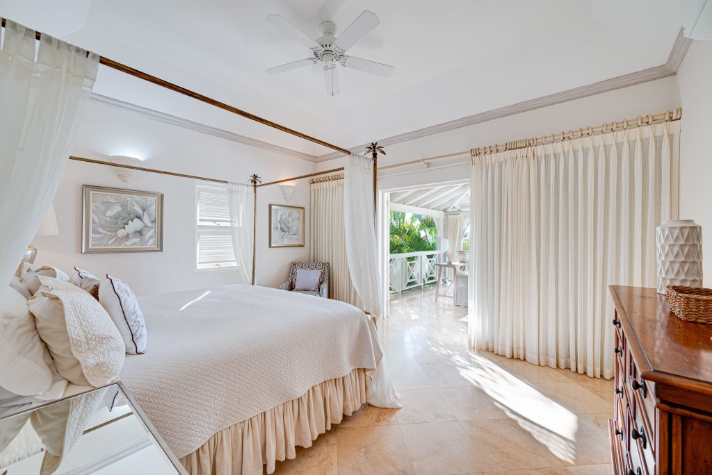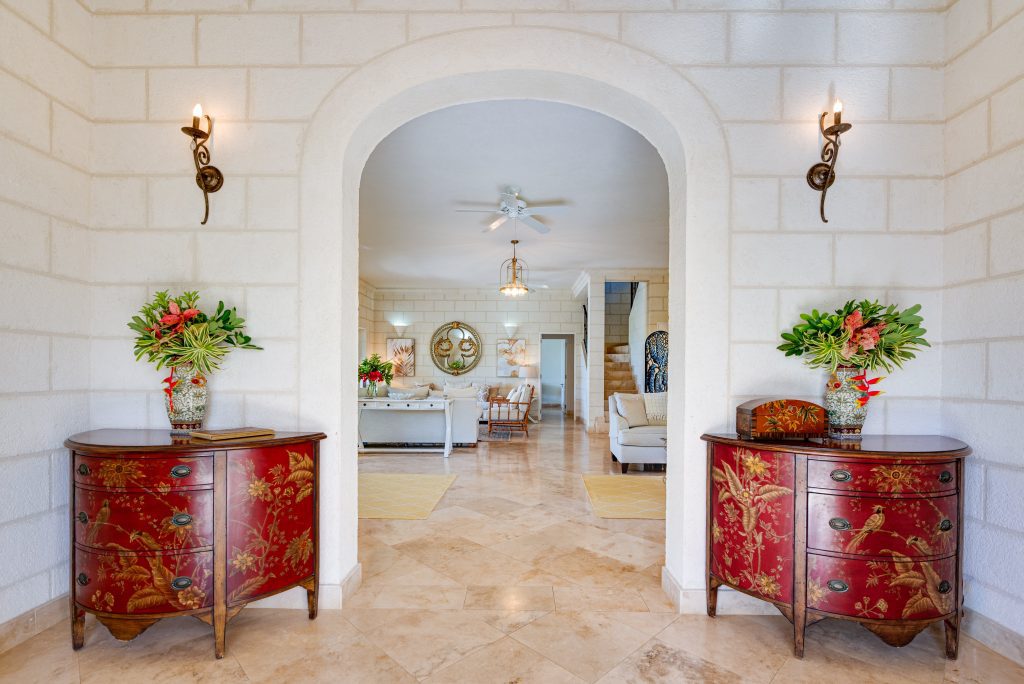 As you step into Calliaqua, you are immediately captivated by its soaring ceilings and the refined elegance of the entry and living areas, with coral-rendered walls and gleaming marble floors setting a tone of sophisticated luxury. The living area flows seamlessly onto a spacious covered terrace, furnished with inviting sofas and a stunning coral stone dining table, perfect for alfresco dining and gathering with loved ones. From here, you’re just steps away from the villa’s sparkling pool, which is surrounded by a sun-drenched deck and vibrant tropical gardens. At one end of the pool deck is an enchanting guest cottage with a private ensuite, while a charming gazebo sits at the other end, ideal for relaxing and enjoying the warm breeze.
